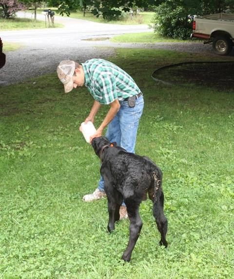 So Mr. Titus called my son, Tucker. Tuck loves animals and knows a lot about taking care of them because he worked on a farm for several years. Mr. Titus didn’t have time to take care of a baby calf, so he offered to give him to Tuck. We were all surprised when Tuck came home with a tiny black calf in his truck. The baby would have to be fed from a bottle several times a day, so he had to come and live with Tuck and the rest of us until he was old enough to eat grass.